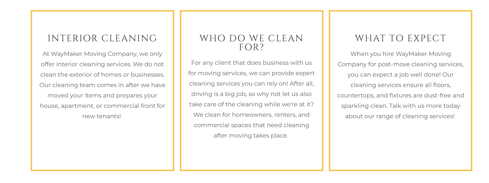 Once everything is moved, some cleaning typically needs to happen! After all, you want your space to be welcoming for new inhabitants, and in many cases, it's a requirement that previous homeowners have their houses in mint conditioning for new occupants. The same can be said for apartments and commercial fronts. With WayMaker Moving Company, we help you get moved and provide cleaning services after the move! With our team, you can rest easily knowing your items will be safely transported and your current residence won't be left in shambles but will be expertly cleaned from top-to-bottom.